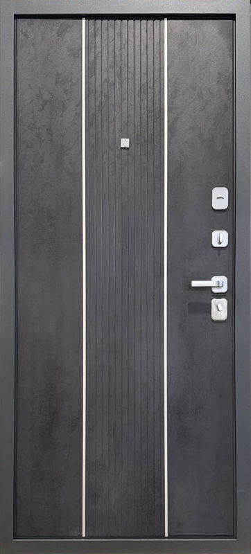 Стальная дверь 3K Верта предлагается в цвете внутренней панели ПВХ Бетон Антрацит с 3-мя контурами уплотнения для ещё большей защиты Вашей квартиры от посторонних шумов и запахов, а внутреннее наполнение из базальтовой плиты надежно уберегут Вас от проникновения холода. Замочные карманы с механизмами 4 класса взломостойкости усиленны дополнительным листом металла